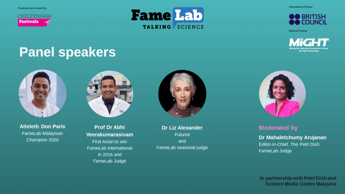The Famelab Webinar hosted on March 13 was organised by the British Council, the Malaysian Industry-Government Group for High Technology (MIGHT), The Petri Dish and The Science Media Centre.