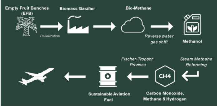 Through biomass gasification, this EFB will first be pelletised and gasified, and undergo thermal conversion thermal conversion to produce syngas, which is then converted into methanol and further refined into Sustainable Aviation Fuel (SAF).