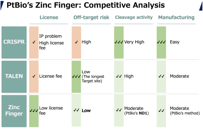 PtBio’s second innovation is ZF-ND1, which combines zinc finger proteins with a novel nuclease (ND1) licensed from Hiroshima University. This system improves on traditional ZFNs by increasing DNA cleavage efficiency without compromising safety.